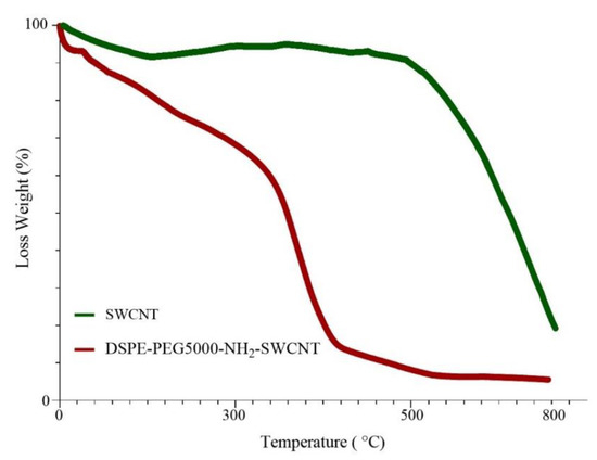 A TGA diagram of pure and functionalized carbon nanotubes is shown in Figure 1. Comparing these two graphs, 66.22% weight loss was observed in DSPE-PEG (5000) amine SWCNT samples in the range of 100 to 450 °C. As for pure SWCNTs, a total mass loss of 6.38% is depicted. If we consider the weight loss of the pure sample as a reference, the % loading of DSPE-PEGs would be 59.84% (Figure 1), which is nearly the same as elemental analysis data. DSPE-PEG loading efficiency was about 91% ± 0.5%, as obtained by the TNBS method.