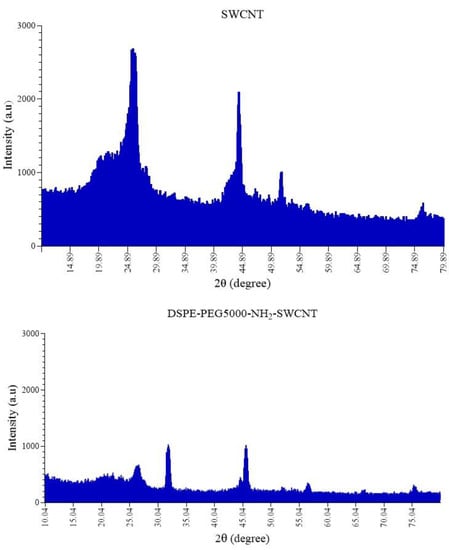 The XRD patterns of SWCNTs and DSPE-PEG (5000) amine SWCNTs were presented in Figure 2. XRD analysis is a unique method to find qualitative properties, such as crystallinity, types, fingerprints, and quantitative material. The main peaks of CNTs are observed at ≈25° (002) and 43° (100). The length and width of peaks were commonly referring to a crystalline or amorphous nature; thus, the width increases with reducing intensity or length, which refers to existing in an amorphous crystal form. Typically, impurities and surface polymer conjugation directly affect the position and intensity of the peaks. As illustrated in Figure 2, functionalization has reduced the intensity of peaks. Peak shifts and new peak emergence are other points of evidence that confirm a new, amorphous structure.