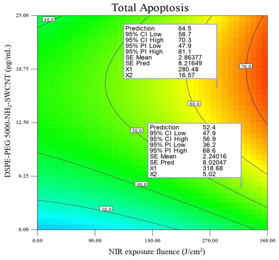From Y1, it was concluded that the model terms A and B have a significant positive effect, but that B2 has a significant negative effect on total apoptosis. From Y2 it was concluded that model terms A, B, and AB positively affect temperature changes (∆T), whereas model terms A2 and B2 had negative effects on Y2. As mentioned above, none of the model terms significantly positively or negatively affect Y3. As shown in Equation (4) (e4), necrosis (Y4) would be affected positively by model term A, while the reverse was observed for model terms C and BC. The response surface contour for total apoptosis (Y1) is shown in Figure 3. This contour plot suggests that a total apoptosis of ≥65% would be achieved in DSPE-PEG (5000) amine SWNT concentrations of 12.5–25 µg/mL and an NIR exposure fluence of 310-360 J/cm2.