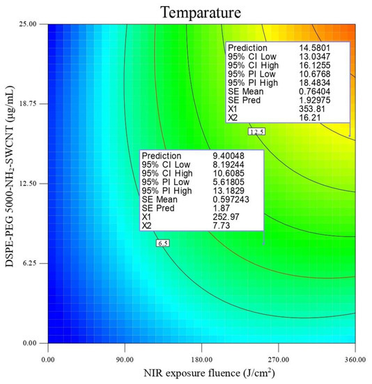 As is observed in Figure 4, NIR exposure fluence and DSPE-PEG (5000) amine SWNT concentration would also directly cause temperature changes in experimental runs. These findings are in accordance with similar studies [54,55]. Our study suggests that temperature changes (∆T) of 9.2–16 °C (Y2) would be achieved in DSPE-PEG (5000) amine SWNT concentrations of 12.5–25 µg/mLy and an NIR exposure fluence of 310–360 J/cm2. These temperature changes would cause a total apoptosis of ≥65% in SKOV3 cells.