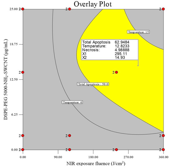 Optimization was performed by setting variables’ constraints in order to obtain optimal solutions that are desirable in all responses simultaneously (Table 1). Meanwhile, the desirability of optimized solutions was kept at 1. An overlay contour plot was finally constructed to indicate an optimal combination of DSPE-PEG (5000) amine SWCNT concentration, NIR exposure fluence, and cell treatment time to gain results.