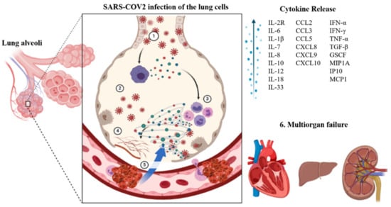 SARS-CoV-2 infection of lungs leading to cytokine storm resulting in multi-organ failure. ① Lung cells infected by the coronavirus, ② Macrophages recognize the virus and release cytokines, ③ Cytokines attract additional immune cells, such as lymphocytes and monocytes, and they generate more cytokines, causing a storm-like cycle of inflammation that damages lung cells. ④ Damage can also occur because of fibrin production (clot formation), ⑤ Blood vessels surrounding the lungs are weakened, allowing fluid to leak into the lung cavities, resulting in respiratory failure, 6. Due to the heightened coagulation state, blood that is meant to flow to other organs such as the heart, liver, and kidneys will be obstructed, causing these organs to fail and lead to multiorgan failure.