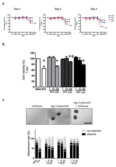 3.2. Effect of BPA, BPS, and BPF on Spheroid Attachment Rate