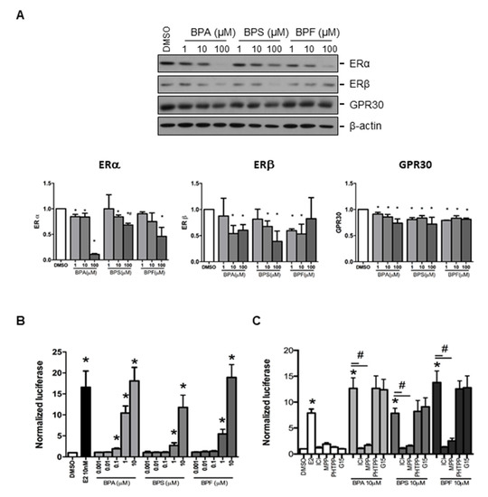 - Dong, S.; Terasaka, S.; Kiyama, R. Bisphenol A induces a rapid activation of Erk1/2 through GPR30 in human breast cancer cells. Environ. Pollut. 2011, 159, 212–218. [Google Scholar] [CrossRef]