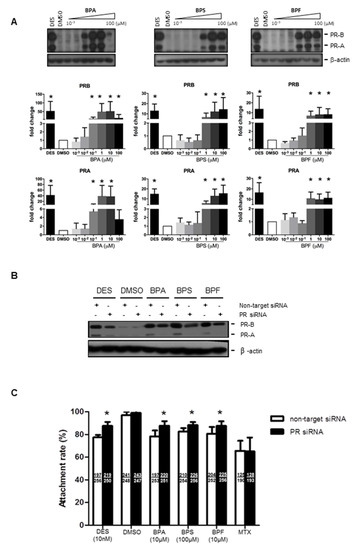 3.5. Effect of BPA, BPS, and BPF on Progesterone Receptor Expression and Spheroid Attacment on Transfected Ishikawa Cells