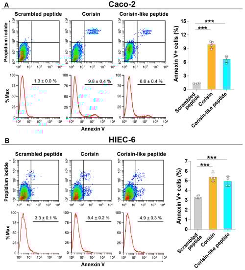 Corisin and corisin-like peptide induce apoptosis of intestinal cells. Caco-2 (A) and HIEC-6 (B) cells were cultured in the presence of corisin or corisin-like peptides for 48 h, and apoptosis was evaluated by flow cytometry. Data are expressed as the mean ± S.D. Statistical analysis by ANOVA with Newman-Keuls’ test. *** p < 0.001.