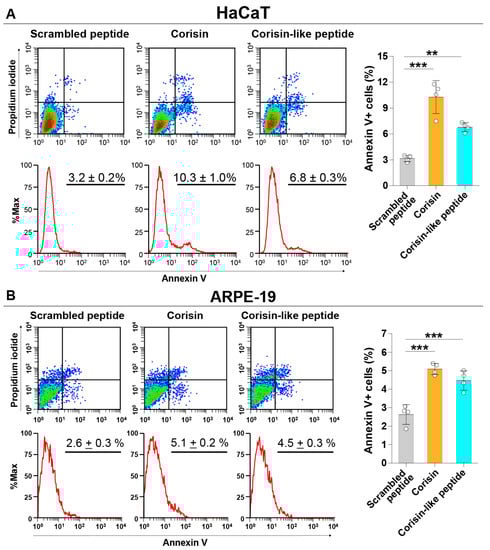Corisin and corisin-like peptides induce apoptosis of keratinocytes and retinal cells. HaCaT (A) cells and ARPE-19 cells (B) were cultured in the presence of corisin or corisin-like peptide for 48 h, and apoptosis was evaluated by flow cytometry. Data are expressed as the mean ± S.D. Statistical analysis by ANOVA with Newman-Keuls’ test. ** p < 0.01; *** p < 0.001.