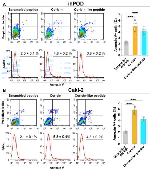 Corisin and corisin-like peptide induce apoptosis of podocytes and renal tubular epithelial cells. Podocytes (A) and Caki-2 cells (B) were cultured in the presence of corisin or corisin-like peptide for 48 h, and apoptosis was evaluated by flow cytometry. Data are expressed as the mean ± S.D. Statistical analysis by ANOVA with Newman-Keuls’ test. *** p < 0.001.