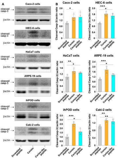 Cleavage of caspase-3 in cells treated with corisin or corisin-like peptide. Colon (Caco-2) epithelial cells, small intestinal (HIEC-6) cells, keratinocytes (HaCaT cells), retinal (ARPE-19) cells, podocytes (ihPOD), and renal tubular epithelial (Caki-2) cells were cultured in the presence of corisin or corisin-like peptide for 24 h, and apoptosis was evaluated by Western blotting (A). Densitometry analysis was performed using ImageJ (B). Data are expressed as the mean ± S.D. Statistical analysis by ANOVA with Newman-Keuls’ test. * p < 0.05, ** p < 0.01, *** p < 0.001.