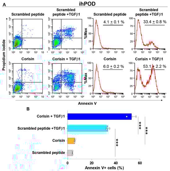 Corisin potentiates the proapoptotic activity of transforming growth factor-β1 synergistically. Podocytes were cultured in the presence of scrambled peptide alone, corisin alone, or TGFβ1 in combination with scrambled peptide or corisin for 48 h and the degree of apoptosis was evaluated by flow cytometry (A). The number of cells was expressed in percentage (B). Data are expressed as the mean ± S.D. Statistical analysis by ANOVA with Newman-Keuls’ test. *** p < 0.001.