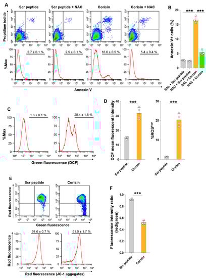 Treatment of intestinal cells is associated with increased generation of reactive oxygen species (ROS) and mitochondrial membrane depolarization. Caco-2 cells were pre-incubated with or without N-acetyl-l-cysteine and then treated with 10 μg/mL of corisin or scrambled peptide before evaluating apoptosis by flow cytometry (A,B). To detect cellular ROS, Caco-2 cells were treated with 5 μM corisin or scrambled peptide, washed with phosphate-buffered saline, incubated with medium containing 2′,7′-dichlorofluorescin diacetate (DCFDA) and then evaluated by flow cytometry (C,D). The JC-1 dye was used to evaluate mitochondrial membrane integrity. Caco-2 cells were treated with corisin or scrambled peptide, and then cells were stained with JC-1 before assessing by flow cytometry (E,F). Data are expressed as the mean ± S.D. Statistical analysis by ANOVA with Newman-Keuls’ test. *** p < 0.001.