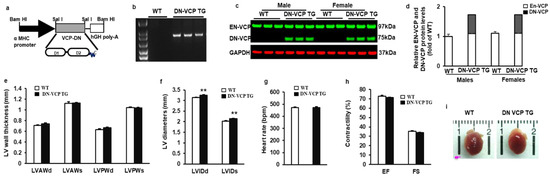 Identification and characterization of cardiac-specific VCP dominant-negative transgenic mouse (DN-VCP TG) at the age of 10 weeks. (a). The construct of the cardiac-specific DN-VCP TG mouse model; (b,c). Identification of DN-VCP TG by genotyping with PCR (b) and protein expression in the hearts by Western blots (c); (d). the relative value of endogenous VCP (EN-VCP) and overexpressed DN-VCP in TG and WT mice of both genders; (e–h). The morphology and function of DN-VCP TG vs. WT by echocardiography at a young age, in terms of left ventricle (LV) wall thickness including LV anterior and posterior wall thickness at end-diastole and end-systole (LVAWd, LVAWs, LVPWd, and LVPWs) (e), LV internal end-diastolic and end-systolic dimensions (LVEDd and LVEDs) (f), heart rates (g), and contractility reflected by LV ejection fraction (EF) and fractional shortening (FS) (h). **, p < 0.01 vs. age-matched WT mice. N = 11-12/group; (i). The examples of the heart shape and size of DN-VCPTG vs. WT mice at the age of 10 weeks.