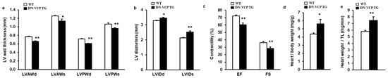 The cardiac morphology and function were further determined in these mice by echocardiography at the age of 10 weeks. As shown in Figure 1e, there is no significant difference in LV wall thickness between WT and TG mice in terms of LVAWd, LVAWs, LVPWd, and LVPWs. However, LV internal dimensions (LVEDd and LVEDs) were increased in DN-VCP TG mice compared to their age-matched WT mice (p < 0.01) (Figure 1f), indicating a cardiac dilatation in the TG mice at this early age stage. The cardiac function is comparable between two groups at this age, represented by a similar heart rate (Figure 1g), LV EF, and FS (Figure 1h). In addition, the overexpression of DN-VCP in the heart does not alter mouse mortality or the gender distribution of their offspring. There is no significant difference in the heart’s development in DN-VCP TG compared to their litter-matched WT mice in terms of the cardiac anatomic structure, shape, and size (Figure 1i) at 10 weeks.