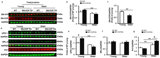 Together, these data indicate an age-related alteration in EN-VCP and its functionally associated proteins in the WT mice during the aging transition; these changes were aggravated in DN-VCP TG mice. Interestingly, ENVCP and UFD-1 exhibit a similar pattern to the changes between WT and TG mice during the aging transition (Figure 3b,e), while the P47 showed an opposite change to them in these mice (Figure 3g).