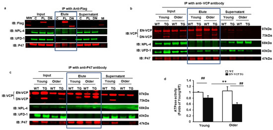 DN-VCP disrupts the VCP-cofactor interaction and leads to a binding preference of EN-VCP with the repressive protein P47. (a). Immonuoparticipation (IP) with anti-Flag and the Western blotting with the antibodies against the corresponding proteins in the cells overexpressed full-length VCP (FL-VCP) and dominant-negative VCP (DN-VCP) compared to the vector control. C: control plasmid with vector; FL: overexpressed full-length VCP, DN overexpressed DN-VCP; M: Molecular weight marker; (b,c). The representative images of the Western blots with the antibodies against the corresponding proteins after IP in cytoplasmic fractions of mouse heart tissues with anti-VCP (b) or anti-P47 (c). Input proteins were used as positive control and the supernatants of the IP were used as the negative control; (d). ATPase activity in DN-VCP TG and WT mouse heart tissues at young and older ages. **, p ≤ 0.01 vs. corresponding young mice, ##, p ≤ 0.01 vs age-matched WT mice.