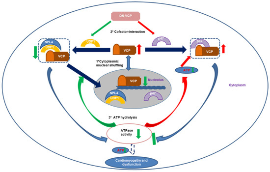 The summary of the findings: The results indicate that dominant-negative VCP (DN-VCP) acts as a dominant-negative mutation inhibiting VCP function in the mouse hearts through a comprehensive mechanism by impairing the endogenous VCP (EN VCP) and its co-factors cytoplasmic/nuclear shuffling, interfering EN-VCP-cofactor binding preference, and repressing ATP hydrolysis, resulting in a progressive dilated cardiomyopathy and dysfunction during the aging transition. Blue arrows: regular biological effects; Red arrows: increase or activating; Green arrows; decrease or inhibiting. UFD-1: ubiquitin fusion degradation protein 1; NPL-4: nuclear protein localization protein 4.