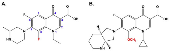 Chemical structures of lomefloxacin (A) and moxifloxacin (B).