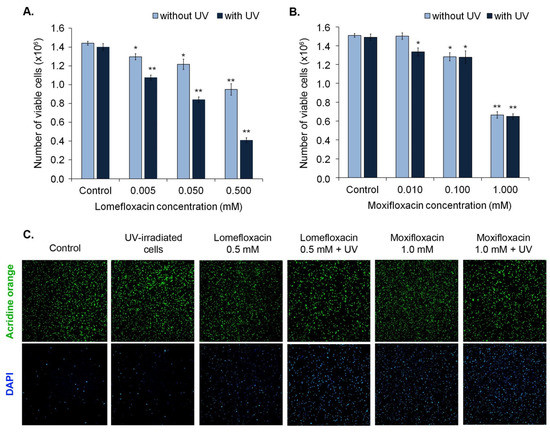 Impact of fluoroquinolones on melanocytes viability. The cells were exposed to lomefloxacin in concentrations of 0.005 mM, 0.05 mM, and 0.5 mM (A) and moxifloxacin in concentrations of 0.01 mM, 0.1 mM, and 1.0 mM (B). Cell number was determined after 24 h since the irradiation. Bar graph represents mean number of cells per dish ± SD from three independent experiments. * p < 0.05, ** p < 0.01 vs control. (C). Representative images were obtained using NucleoCounter NC-3000 fluorescence image cytometer. Acridine orange stained all cells in the sample and DAPI stained the dead cells.