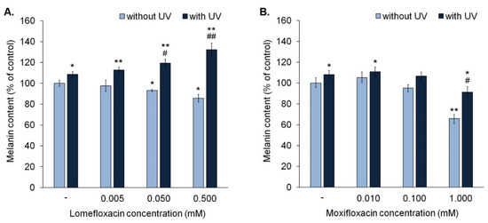 Fluoroquinolones alone decrease melanin content in melanocytes. Lomefloxacin potentiates the impact of UVA radiation (1.3 J/cm2) on melanin content. The cells were exposed to lomefloxacin in concentrations of 0.005 mM, 0.05 mM, and 0.5 mM (A) and moxifloxacin in concentrations of 0.01 mM, 0.1 mM, and 1.0 mM (B). Data were presented as % of the control. Bar graph represents mean ± SD from three independent experiments. * p < 0.05, ** p < 0.01 vs. control; # p < 0.05, ## p < 0.01 vs. non-treated cells exposed to UVA radiation.