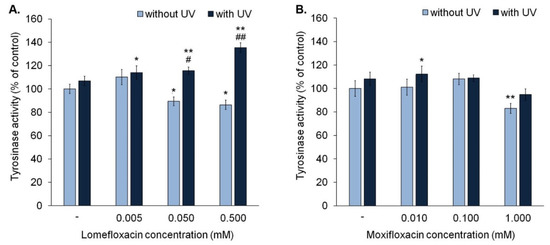 Lomefloxacin magnifies the effect of UVA radiation (1.3 J/cm2) on tyrosinase activity. The cells were exposed to lomefloxacin in concentrations of 0.005 mM, 0.05 mM, and 0.5 mM (A) and moxifloxacin in concentrations 0.01 mM, 0.1 mM, and 1.0 mM (B). Data were presented as % of the control. Bar graph represents mean ± SD from three independent experiments. * p < 0.05, ** p < 0.01 vs. control; # p < 0.05, ## p < 0.01 vs. non-treated cells exposed to UVA radiation.