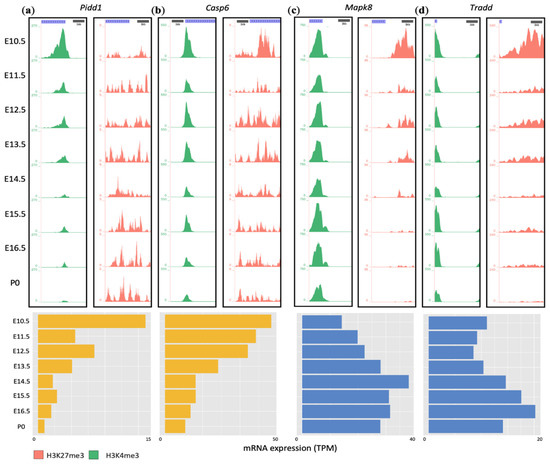 3.5. Developmental Remodeling of H3K4me3 and H3K27me3 Marks Underscores Expression Changes of Pidd1, Casp6, Mapk8, and Tradd
