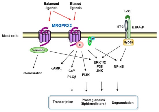 Scheme of the signal pathway after MGPRX2 activation. MRGPRX2 ligands activate Gi protein, which induces a cAMP decrease, Ca2+ mobilization, and also activates MAPKs, PI3K, and NF-κB pathways, which lead to degranulation, induction of transcription, and production of prostaglandins. Balanced MRGPRX2 ligands not only activate Gi protein but also recruit β-arrestin to induce internalization, while biased MRGPRX2 ligands cannot recruit β-arrestin. Additionally, IL-33 enhances MRGPRX2 signaling by activating MAPKs and NF-κB.