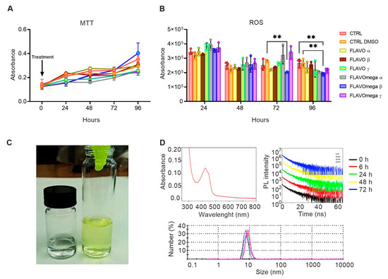 (A,B) MTT-based cell proliferation assay and ROS detection assay (0–24–48–72–96h) on untreated C2C12 cells (CTRL), C2C12 cells treated with vehicle of FLAVOmega β (CTRL DMSO), C2C12 treated with formulation FLAVO α, FLAVO β, FLAVO γ, FLAVOmega α, FLAVOmega β and FLAVOmega γ (n = 3 for each experimental group). Relative luminescence units were measured by GloMax Discover System (Promega Corporation, USA) at 570 nm. (B) Two-way ANOVA followed by Tukey’s multiple comparison test: C2C12 cells treated with FLAVOmega β compared to CTRL DMSO (** p = 0.0040) at 72 h after treatment; C2C12 treated with FLAVOmega β compared to CTRL (** p = 0.0048) and CTRL DMSO (** p = 0.0046) at 96 h. All values are expressed as the mean ± SD. (C) Representative image of FLAVOmega β formulation. (D) Absorption spectrum of FLAVOmega β formulation (top left); time-resolved PL of FLAVOmega β formulation (top right); dynamic light scattering (DLS) analysis of FLAVOmega β formulation (bottom).