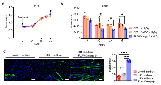(A,B) MTT-based cell proliferation assay and ROS detection assay (8–24–48–72 h) on CTRL, CTRL DMSO and C2C12 treated with FLAVOmega β formulation (n = 3 for each experimental group) with addition of H2O2. Relative luminescence units were measured by GloMax Discover System (Promega Corporation, USA) at 570 nm. (A) MTT-based cell proliferation assay: Two-way ANOVA: C2C12 treated with FLAVOmega β compared to CTRL at 72 h (* p = 0.0288) after treatment. (B) ROS detection assay: Two-way ANOVA: C2C12 treated with FLAVOmega β compared to CTRL DMSO at 24 h (* p = 0.0273); C2C12 treated with FLAVOmega β compared to CTRL at 48 h (* p = 0.0450) and 72 h (* p = 0.0460) after treatment. All values are expressed as the mean ±SD. (C) Immunofluorescence analysis of desmin (green) and DAPI (blue) in C2C12 cells with growth medium, C2C12 with differentiation medium and C2C12 with differentiation medium treated with formulation FLAVOmega β. Scale bar: 200 µm. In the lateral panel, comparison of the calculated fusion index for the three conditions. t-test: (**** p < 0.0001).