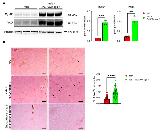 (A) Western blot analysis of proteins involved in muscle regeneration process in skeletal muscles of mdx mice treated with FLAVOmega β and untreated mdx mice (n = 3 mice/each group). Representative images of PAX7 and MyoD1 blots. In the lateral panel, densitometric analysis of data, expressed as the ratio of the different proteins on vinculin in arbitrary units. t-test: ** p = 0.0050, *** p = 0.0002. (B) Representative images of immunohistochemistry staining of mdx mice treated with FLAVOmega β and untreated mdx mice skeletal muscles mice (n = 3 mice/each group, n = 74 slices/3m mdx, n = 129 slices/3m mdx + FLAVOmega β) and endogenous tissue background control. Scale bar left panel: 200 µm; Scale bar right panel: 50 µm. t-test: **** p < 0.0001.