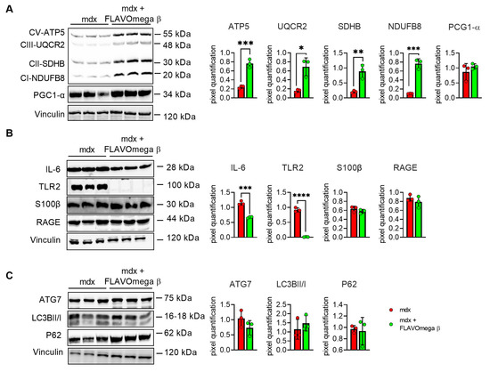 We performed Western blot analysis to investigate metabolism processes and inflammatory pathways. We observed a slight, but not significant, increase of PGC1-α expression, which plays a central role in the regulation of cellular energy metabolism, stimulating mitochondrial biogenesis [24]. Moreover, the analysis confirmed an increase of the OXPHOS complexes in muscles from mdx mice treated with FLAVOmega β, compared with age-matched untreated mice, in line with the abundancy of more oxidative fibers, enriched in mitochondria and capillaries. We detected increased levels of CV-ATP5A (p = 0.0007), CIII-UQCRC2 (p = 0.0100), CII-SDHB (p = 0.0069), CI-NDUFB8 (p = 0.0004) after FLAVOmega β treatment (Figure 6A), which also modulated the inflammatory process as demonstrated by the downregulation of IL-6 (p = 0.0003) and TLR2 (p < 0.0001) in mdx mice treated with FLAVOmega β compared to mdx mice control. Similarly, Western blot analysis on S100-β and RAGE proteins showed a slightly decreased protein level in treated mdx mice compared to the control group (Figure 6B). Finally, we investigated autophagic protein expression, but did not find any relevant modulation of P62, LC3B, and ATG7 proteins after FLAVOmega β treatment (Figure 6C).