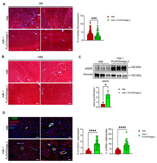 (A) Evaluation of fibrosis in cardiac tissues of mdx mice treated with FLAVOmega β and untreated mdx mice. Representative images of AM staining of cardiac tissue of 3-month-old mdx mice (n = 3 mice; n = 186 slices/3m mdx, n = 109 slices/3m mdx + FLAVOmega β). Histogram represents the percentage of fibrotic area per section of mdx mice. Scale bar: 200 µm. t-test: *** p = 0.0006. (B) Representative images of H&E staining of mdx mice treated with FLAVOmega β and untreated mdx mice cardiac tissue. Scale bar: 200 µm. (C) Western blot analysis of eNOS protein in cardiac tissue of mdx mice treated with FLAVOmega β and untreated mdx mice (n = 3 mice/each group). In the inferior panel, densitometric analysis of data, expressed as the ratio of eNOS on vinculin in arbitrary units. t-test: * p = 0.0136. (D) Immunofluorescence analysis of CD31 (violet), isolectin (red) and α-SMA (green) in cardiac tissue of mdx mice treated with FLAVOmega β and untreated mdx mice (n = 3 mice/each group, n = 9 sections/3m mdx, n = 9/3m mdx + FLAVOmega β). Nuclei were counterstained with DAPI (blue). Scale bar left panel: 100 µm; scale bar right panel: 25 µm. t-test: **** p < 0.0001. All values are expressed as mean ± SD.