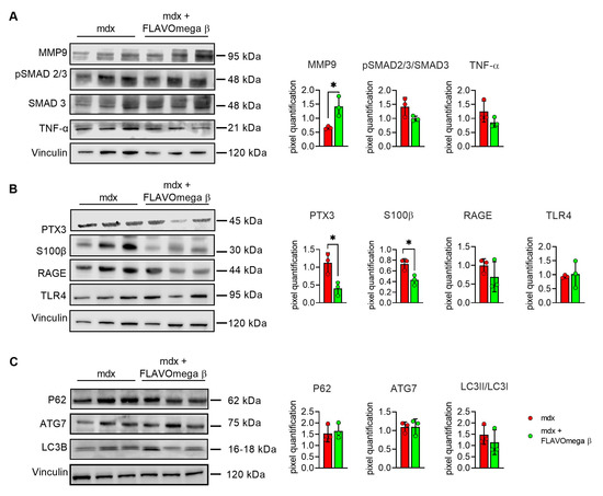 (A–C) Western blot analysis of fibrotic, inflammatory and autophagic pathways in cardiac tissue of mdx mice treated with FLAVOmega β and untreated mdx mice (n = 3 mice/each group). (A) Representative blots of TNF-α, MMP9, pSMAD2-3 and SMAD3. In the lateral panel, densitometric analysis of data, expressed as the ratio of the different proteins on vinculin in arbitrary units. t-test: * p = 0.0207. (B) Representative blots of PTX3 mechanism and its alarmins: RAGE, S100β and TLR4. In the lateral panel, densitometric analysis of data, expressed as the ratio of the different proteins on vinculin in arbitrary units. t-test: * p = 0.0222, * p = 0.0214. (C) Representative blots of LC3B, P62 and ATG7. In the lateral panel, densitometric analysis of data, expressed as the ratio of the different proteins on vinculin in arbitrary units. All values are expressed as mean ± SD.