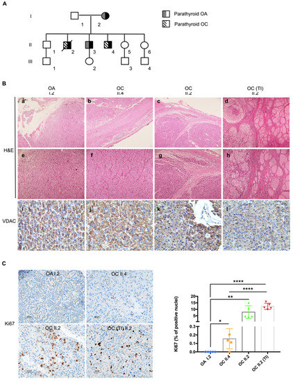 HPT-JT family shows a predisposition to develop parathyroid tumors characterized by an oncocytic phenotype. (A) Pedigree of the family with HPT-JT. In black: family members affected by the syndrome. (B) Histological analysis of the tumors. Haematoxylin and eosin (H&E) staining (a–h); magnification: 5× in a–d; 10× in (e–h). Immunohistochemistry analysis of FFPE sections from HPT-JT tumors, using antibody against VDAC (i–l); magnification 40×). OA—Parathyroid oncocytic adenoma, OC—parathyroid oncocytic carcinoma, TI—thyroid infiltration of the OC. (C) Representative images of Ki67 immunohistochemistry staining (magnification 20×) and quantification of cells displaying Ki67 positive nuclei in HPT-JT tumors. Scale bar 50 µm. Data are mean ± SD. p-value < 0.05 (*); p-value < 0.01(**); p-value < 0.0001 (****).
