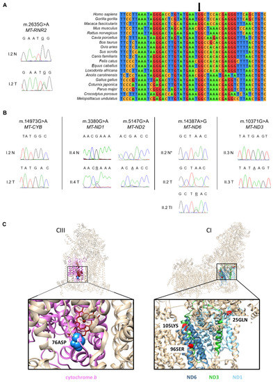 - McCormick, E.M.; Lott, M.T.; Dulik, M.C.; Shen, L.; Attimonelli, M.; Vitale, O.; Karaa, A.; Bai, R.; Pineda-Alvarez, D.E.; Singh, L.N.; et al. Specifications of the ACMG/AMP Standards and Guidelines for Mitochondrial DNA Variant Interpretation. Hum. Mutat. 2020, 41, 2028–2057. [Google Scholar] [CrossRef]