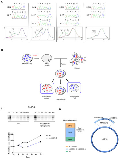 The homoplasmic shift of the m.2356A>G affects mitoribosome activity. (A) Electropherograms and dHPLC analysis of the germline m.2356A>G in MT-RNR2. The retention time (min) depends on the differences in the heteroduplex composition: one elution curve represents the homoplasmic state (mutated or wild-type), two elution curves indicate heteroplasmy. Patient I.2: heteroplasmy in blood (N) and near-homoplasmic mutated in adenoma (T). Patient II.4: heteroplasmy in blood (N) and in normal parathyroid tissue (N*); near-homoplasmic mutated in the parathyroid carcinoma (T). Patient II.2: heteroplasmy in normal thyroid tissue (N*) and near-homoplasmic wild-type in the parathyroid carcinoma (T) and in the thyroid infiltration (TI). Patient II.3: near-homoplasmic mutated in both blood (N) and parathyroid adenoma (T). (B) Schematic representation of transcytoplasmatic hybrids (cybrids) generation. Osteosarcoma 143B.TK− cells treated with ethidium bromide (BrEt) undergo mtDNA depletion resulting in Rho0 cell line generation. Rho0 cells are then fused with patients’ platelets, generating cybrids that carry various heteroplasmic loads of the mtDNA mutation (red: mitochondria carrying the m.2356A>G; blue: wild-type mt-DNA). (C) In gel activity for CI (CI-IGA) in cybrids carrying the homoplasmic m.2356A>G and wild-type mtDNA (WT). Two different CI-IGA experiments were carried out. For each experiment we have separated OXPHOS complexes from two independent mitochondrial protein extractions from pools of homoplasmic mutants (n = 2) and wild-type cells (n = 2). Band intensity was quantified by densitometry and data were normalized on untreated (UT) samples (mean ± SEM). (D) Heteroplasmic levels (%) of MT-RNR2 mutations in I.2 adenoma. The fraction of MT-RNR2 molecules carrying only the germline m.2356A>G is indicated in orange; the fraction of molecules carrying both the germline m.2356A>G and the somatic m.2635G>A is indicated in blue; the m.2635G>A has not been detected alone; wild-type (WT) MT-RNR2 is indicated in green.
