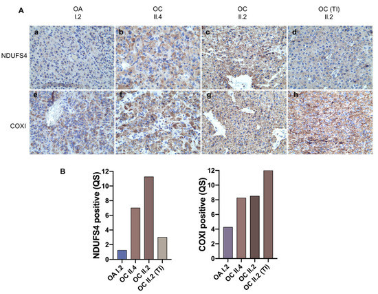 Once the full spectrum of mutations was acquired in all tumors, we sought evidence for a pathogenic effect that the combination of variants may have on respiratory complexes. Indeed, it is widely accepted that mtDNA mutations in oncocytic tumors often lead to disassembly of one or more OXPHOS complexes, which can be highlighted by validated IHC staining for specific protein subunits, such as nuclear-encoded NDUFS4 [13,46,54,55,56,57] or mtDNA-encoded CIV subunit COXI to infer the pathogenic potential of tRNA and rRNA mutations, whose effects may impinge on mitochondrial protein synthesis [58,59]. We hence exploited these validated methods on the family tumors for which sufficient material was available. NDUFS4 staining was faint in the I.2 oncocytic adenoma and predictive of a structural CI derangement, in agreement with its rather indolent clinical behavior, and in correlation with a mild COXI IHC positivity (Figure 4A(a,e)).