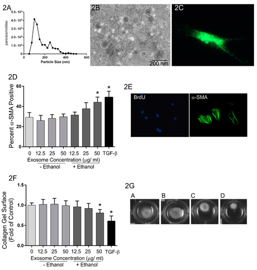Along these lines, previously unpublished studies from our group have been carried out to evaluate the role of exosome-mediated communication between heart myocytes and fibroblasts in the pro-fibrotic response to alcohol abuse. Chronic abuse of alcohol deleteriously impacts most organ systems and approximately one-third of individuals who abuse alcohol long-term develop alcoholic cardiomyopathy. This condition is accompanied by myocardial remodeling that includes cardiomyocyte apoptosis and fibrosis and often results in heart failure [101]. In these experiments, H9c2 cardiomyocytes were treated with or without ethanol (200 mg/dL) for 24 h and exosomes purified from conditioned medium by filtration followed by ultracentrifugation. Extracellular vesicles generated by this purification scheme were somewhat heterogeneous in size with most below 100 nm in diameter (Figure 2A,B). Isolated rat cardiac fibroblasts were then treated with exosomes and the expression of α-smooth muscle actin and the contraction of three-dimensional collagen gels evaluated as assays of fibroblast activation (Figure 2D–G). Exosomes isolated from H9c2 cells not exposed to ethanol had no effect on the expression of α-smooth muscle actin (Figure 2D) nor on contraction of three-dimensional collagen hydrogels by fibroblasts (Figure 2F,G). In contrast, treatment of fibroblasts with exosomes isolated from H9c2 cells exposed to ethanol demonstrated increased α-smooth muscle actin staining and enhanced collagen hydrogel contraction. While the molecular mechanisms of this effect have not been identified, these data suggest that exposure to ethanol likely induces alterations in cardiomyocyte exosomal cargo, which in turn promotes fibroblast activation.