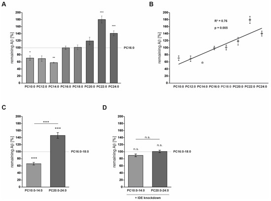In order to investigate whether the effects of FA acyl chain length on total Aβ degradation are dependent on IDE, the experiment was replicated by using stably transfected Neuro2a IDE-knockdown cells (Neuro2a IDE KD). IDE protein level and total Aβ degradation is strongly reduced in this cell line compared to the mock-transfected control cells (Neuro2a control) used above (Supplementary Figure S4A,B) [31,45]. As shown in Figure 1D, neither PC10:0–14:0 nor PC20:0-24:0 significantly affected total Aβ degradation in the Neuro2a IDE KD cells compared to PC16:0–18:0 (p = 0.129 and p = 0.969, respectively). In this cell line, none of the used single PC species significantly altered the total Aβ degradation in comparison to PC16:0 (Supplementary Figure S4C,D). Accordingly, and in contrast to the corresponding control cells, Neuro2a IDE KD cells displayed no significant correlation between the FA acyl chain length and the level of remaining human Aβ40 peptides (R2 = 0.17, p = 0.31) (Supplementary Figure S4E). These results indicate that saturated MCFAs/shorter-chained FAs and saturated VLCFAs affect Aβ degradation conducted by IDE.