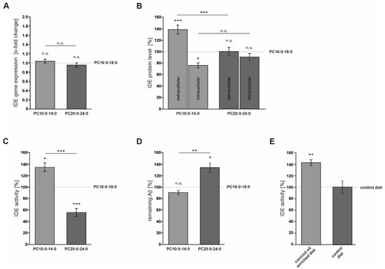Cells were seeded on 6-well plates and treated with phospholipids as described above. Total RNA was extracted from cells by using Trizol Reagent (Thermo Fisher Scientific, Schwerte, Germany) according to manufacturer´s guidelines. The purity and concentration of the isolated RNA were analyzed by absorbance measuring using a Nano Drop 2000 (Thermo Fisher Scientific, Schwerte, Germany). Only samples with a 260 nm/280 nm and a 260 nm/230 nm ratio ≥ 1.8 were used. Reverse transcription of 2 µg RNA was carried out by utilizing the High-Capacity cDNA Reverse Transcription Kit (Thermo Fisher Scientific, Schwerte, Germany) according to manufacturer´s protocol. Quantitative real-time PCR (RT-PCR) was performed with the Fast SYBR Green Master Mix (Thermo Fisher Scientific, Schwerte, Germany) and a PikoReal Real-Time PCR System (Thermo Fisher Scientific, Schwerte, Germany). Changes in IDE gene expression (IDE) were calculated with the 2-(ΔΔCt) method [50] after normalization to β-actin gene expression (ACTB). The following primer pairs (Eurofins MWG Operon, Eberberg, Germany) were used: ACTB: 5′-CCTAGGCACCAGGGTGTGAT-3′ and 5′-TCTCCATGTCGTCCCAGTTG-3′; IDE: 5′-GCTACGTGC AGAAGGACCTC-3′ and 5′-TGGACGTATAGCCTCGTGGT-3′.