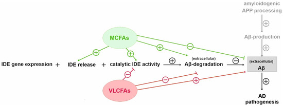In general, lipids seem to play an important role in the pathogenesis of AD. There are extensive alterations in the lipid and fatty acid (FA) composition of human brain tissue affected by the disease. This might influence Aβ production, since a strong effect of the lipid environment on proteolytic APP-processing is well established [33,34]. In contrast, the impact of lipid homeostasis on Aβ-degrading mechanisms is largely unknown. Therefore, in the present study, we analyzed the effect of FA acyl chain length on Aβ degradation. This is of particular interest as medium-chain FAs (MCFAs), similarly to PUFAs, have been reported to be advantageous in mild cognitive impairment (MCI) and early stages of AD. MCFAs are saturated FAs (SFAs) consisting of 6 to 12 carbon atoms, which can be nutritionally administered as medium-chain triglycerides (MCTs) or coconut oil. The effects of MCFAs in helping ameliorate the cognitive decline caused by AD are generally attributed to the elevation of circulating ketone bodies, compensating for the impaired cerebral glucose metabolism [35,36,37,38,39,40,41,42,43]. However, we recently found that the MCFA decanoic acid (10:0) promotes neuronal health independent of ketone levels by reducing oxidative stress levels [44]. The results of the present study revealed that MCFAs might additionally act by stimulating IDE-dependent Aβ degradation, while saturated very long-chain FAs (VLCFAs) have the opposite effect.