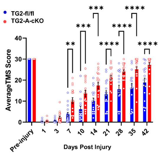 Previously we demonstrated that deletion of TG2 from astrocytes or treatment with the selective TG2 inhibitor VA4, significantly increases their survival in OGD conditions [6,13]. Deletion of TG2 from astrocytes also significantly increases their ability to protect neurons from ischemic-induced death [6,39]. Given the fact that TG2 regulates transcriptional processes [40,41], we carried out RNA-seq on wild type and TG2-/- astrocytes and found that pro-survival/pro-regenerative genes were upregulated in the TG2-/- astrocytes [39]. Although these findings indicate that deletion of TG2 from astrocytes is beneficial in the context of CNS injury, this needs to be tested in an in vivo model. Therefore, we used TG2-A-cKO and TG2fl/fl mice [39] in a contusion SCI model followed by analysis of motor function over a 42-day period. Remarkably, motor function in the mice with astrocytic TG2 deleted was significantly better starting at 7 dpi and continuing through 42 dpi. In fact, by 35 dpi many of the TG2-A-cKO mice had recovered most of their motor function based on the TMS score (Figure 1). These data clearly indicate that in vivo deletion of TG2 from astrocytes enhances their supportive role post traumatic injury.