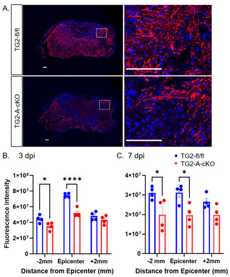 3.2. Deletion of TG2 from Astrocytes Results in a Significant Attenuation of Reactive Gliosis after SCI
