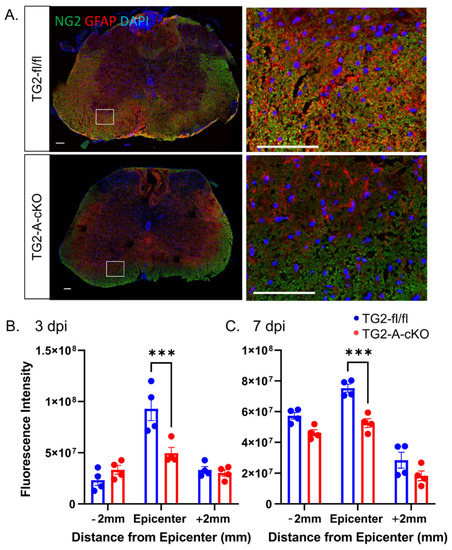 NG2 immunoreactivity is significantly reduced at the lesion site in TG2-A-cKO mice 3 and 7 days after spinal cord injury. (A) Representative images of 3 days post-injury (3 dpi) at the epicenter of the injury. Spinal cord sections were immunostained for NG2 (green), GFAP (red) and counterstained with DAPI (blue). At the right are enlargements of the boxed areas in the images at the left. Scale bars = 100 µm. (B,C) Quantified GFAP immunoreactivity. At 3 and 7 dpi, NG2 levels were significantly at the epicenter in the TG2-A-cKO mice. N = 4 animals per group. *** p < 0.001.
