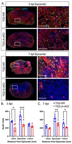 In this study, we demonstrate that astrocytic-specific TG2 deletion results in a significant improvement in functional recovery in a mouse T9 spinal cord contusion injury model. GFAP immunoreactivity was significantly decreased in the TG2-A-cKO compared to TG2fl/fl mice. We further extend these findings and demonstrate that expression of both the transcription factor SOX9 and the chondroitin sulfate proteoglycan (CSPG) NG2 (Cspg4) are significantly decreased in TG2-A-cKO spinal cord compared to TG2fl/fl mice at 3 and 7 days after injury. These are exciting findings as NG2 is part of the astroglial scar and may block successful CNS regeneration [14], while deletion of SOX9 improves outcomes after CNS injury [15,16,17].