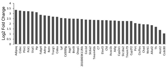 First strand cDNA was reverse transcribed from 500 ng total RNA using Verso cDNA Synthesis Kit (Thermo Scientific, AB1453B). Real-time PCR was performed using PerfeCTa® SYBR® Green FastMix® PCR Reagent (Quantabio, Beverly, MA, USA) on a CFX96 Real-Time System (Bio-Rad Laboratories, Hercules, CA, USA). The primers used in this study were as follows: lipoprotein lipase (Lpl), forward 5′GGGAGTTTGGCTCCAGAGTTT3′, reverse 5′TGTGTCTTCAGGGGTCCTTAG3′; Fatty Acid Binding Protein 4 (Fabp4), forward 5′AAGGTGAAGAGCATCATAACCCT3′, reverse 5′TCACGCCTTTCATAACACATTCC3′; Perilipin 1 (Plin1), forward 5′GGGACCTGTGAGTGCTTCC3′, reverse 5′GTATTGAAGAGCCGGGATCTTTT3′ and Glyceraldehyde-3-Phosphate Dehydrogenase (Gapdh), forward 5′ATGGGACGATGCTGGTACTAG3′, reverse 5′TGCTGACAACCTTGAGTGAAAT3′ (Supplemental Table S2). Relative expression of target transcripts was normalized to Gapdh as a housekeeping control using the ΔΔCt method.