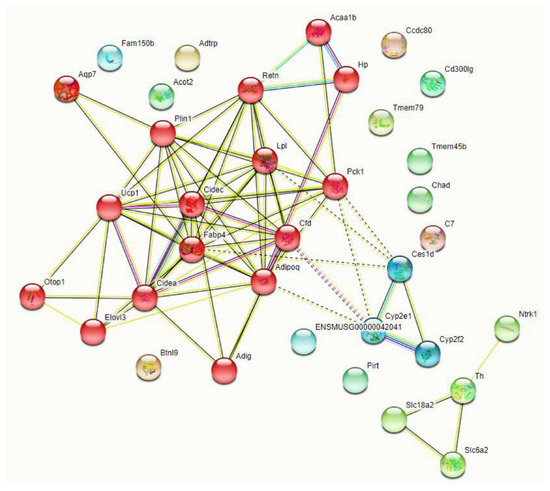 String analyses of genes that were upregulated in injured spinal cord from TG2-A-cKO compared to TG2fl/fl mice. Red hubs are genes that are directly involved in fatty acid metabolism, lipid storage and energy pathways.