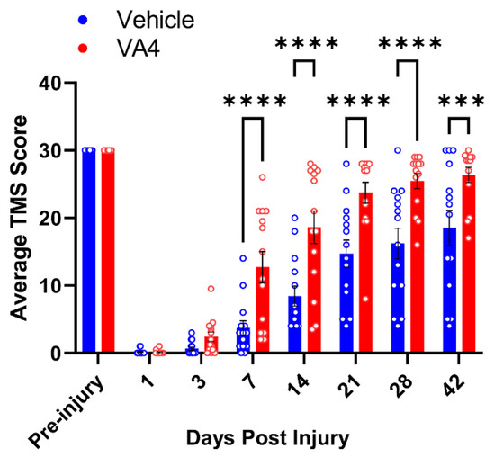 Treatment with the TG2 inhibitor VA4 improves functional recovery after spinal cord injury (SCI). Wild type mice at 12–16 weeks of age (14 mice in each group) were anesthetized and subjected to SCI as in Figure 1. Mice were administered VA4 at 15 mg/kg i.p. 1 h post-injury and then at 24 and 48 h. Control animals received Cremaphor only. Motor function was assessed prior to injury and at the days indicated post-injury using the Toyama mouse score (TMS) to assess locomotor function [25]. Data are expressed as an average of the right hind limb and left hind limb. Data were analyzed by two-way ANOVA with Bonferroni’s multiple comparisons test, *** p < 0.001, **** p < 0.0001.