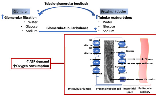 Diabetes [89] and high-glucose conditions upregulate proximal tubule SGLT2 and GLUT2 [48,90], and activate the Na/K ATPase activity [89], leading to an increased cortical oxygen consumption and reduction in the cortical oxygen partial pressure, which were reversed by SGLT2 inhibition [60]. These data indicate that proximal sodium and glucose reabsorption require enhanced oxidative metabolism. A decrease in the cortical oxygen pressure upregulates the hypoxia-inducing factor (HIF1) α, which also enhances GLUT1 mRNA expression that favors glucose uptake in the tubular cells.