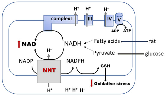 The role of nicotinamide nucleotide transhydrogenase (NNT) in decreasing the reductive and oxidative stress. NNT is an inner mitochondrial membrane enzyme that transfers electrons from mitochondrial NADH to NADPH by using the inner membrane proton motive force to boost the peroxide antioxidant defense, such as reduced glutathione (GSH) [186,187]. The enzyme reduces NADPH by oxidizing NADH that is generated by oxidizing energetic substrates (i.e., fat and glucose), thus decreasing the reductive stress (NADH/NAD ratio).