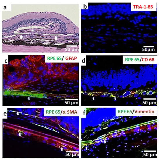 Representative HE and immunostaining images of immunodeficient RCS rat retinas implanted with iPSC-RPE monolayer assessed at 11 months post-implantation. Presence of fibrosis, immunoreactivity, and epithelial–mesenchymal transition (EMT) was assessed. (a) Retina with no surviving iPSC-RPE showing signs of inflammation and peri-membrane fibrosis indicated by white asterisk. (b) Absence of TRA-I-85 staining. (c) Retinas showing RPE65 expressing iPSC-RPE cells (white arrows) labelled for GFAP (glial cells), (d) CD68 (macrophages/microglia), (e) expression of classical mesenchymal markers α smooth muscle actin α SMA and vimentin. (f) Images in which iPSC-RPE monolayer appears to be present below the parylene membrane are either due to orientation difference in the implant placement or due to the survival of the RPE on the lower side of the parylene membrane.